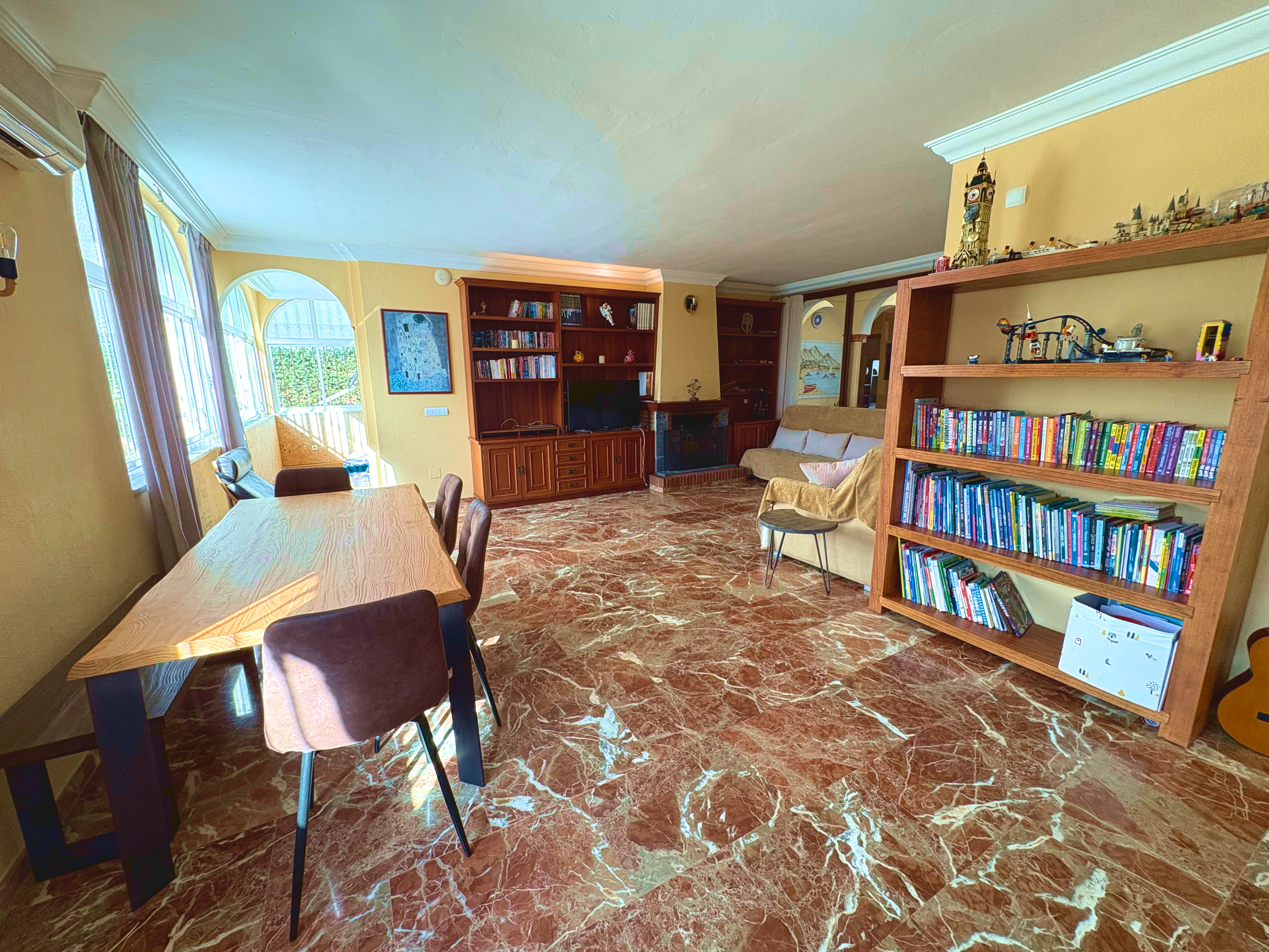 Spacious and bright with marble floors, built-in shelving, and plenty of room for both dining and relaxation.