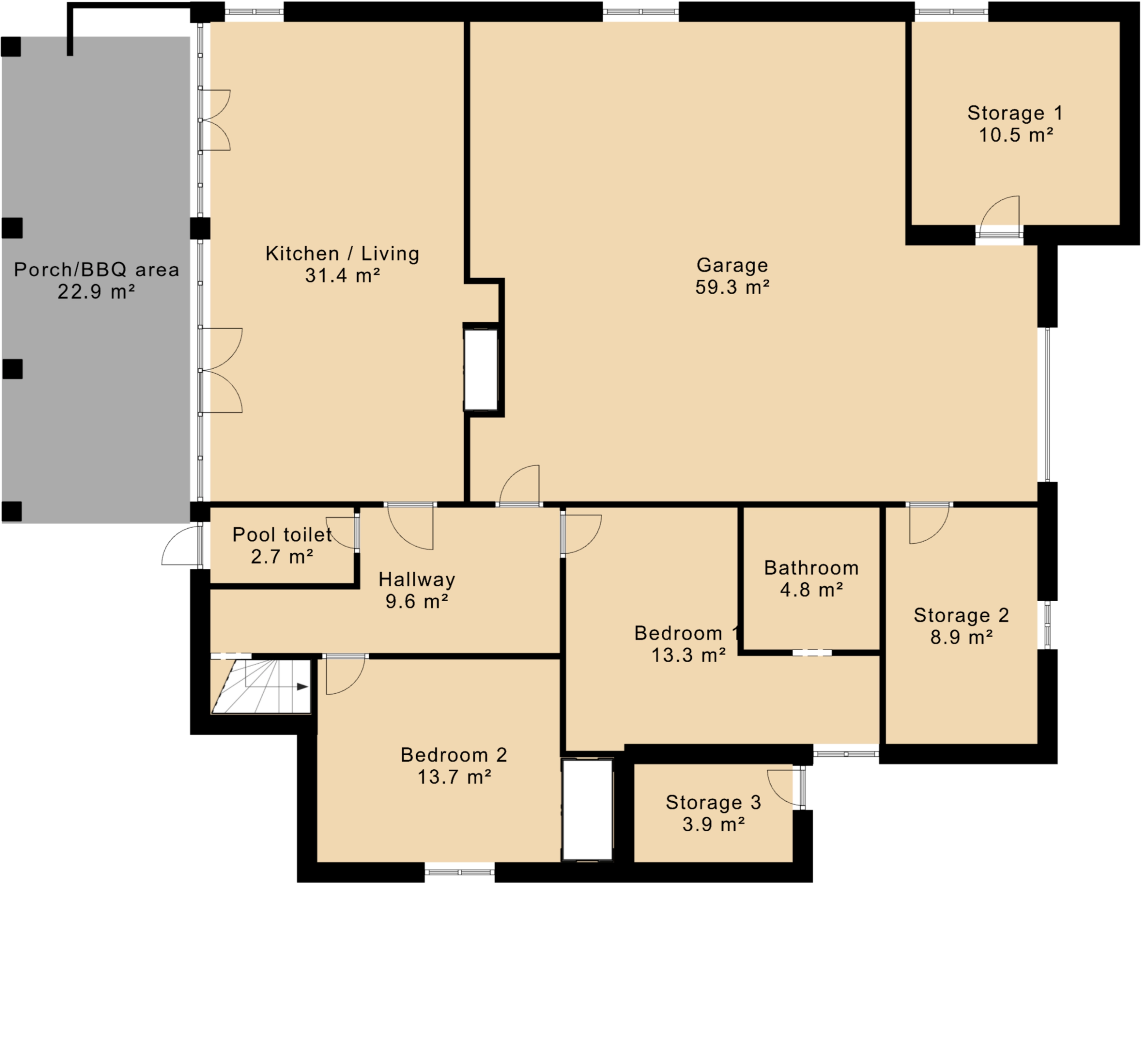 The lower level offers flexibility for guests or extended family, featuring a self-contained apartment with two bedrooms, two bathrooms, and an open living area connected to the garden. Outside, a shaded porch and BBQ zone lead to the pool, playground, and fruit trees, while a spacious garage and storage rooms complete this level.